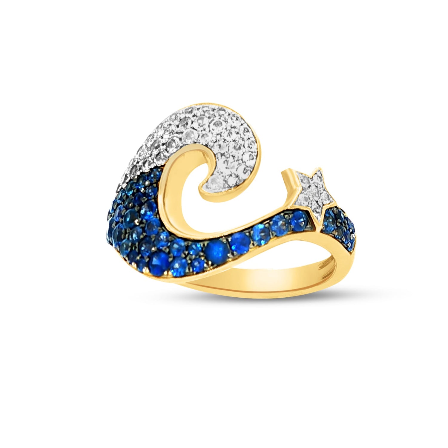 14k 15mm wide wave ring with starfish accent on the wave and with 45 blue sapphires 0.90ct & 44 white sapphires 0.53ct