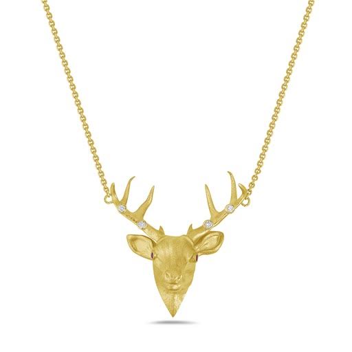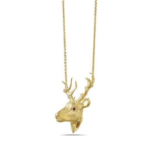 14K DEER HEAD PENDANT 33X18MM WITH 4 DIAMONDS ON ANTLERS 0.09CT & RUBY EYES ON 18 INCHES CABLE CHAIN